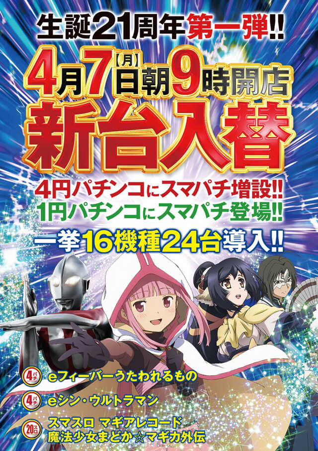 スロット増台(総台数418台)、1円パチンコ増台(全192台)、4円パチンコ各台計数機導入、2階加熱式たばこプレイエリア導入 |