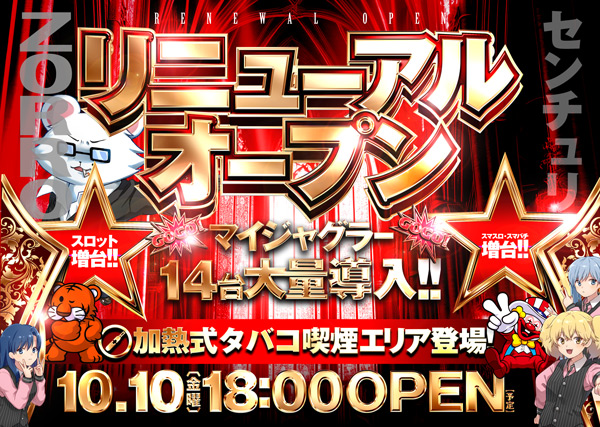 | 2025/10/10 | リニューアル等 | ZORRO呉中通り | 広島県呉市中通4-10-4 | 0 | 144 | 加熱式たばこプレイエリア導入、スロット増台、スマパチ増台、スマスロ増台 |